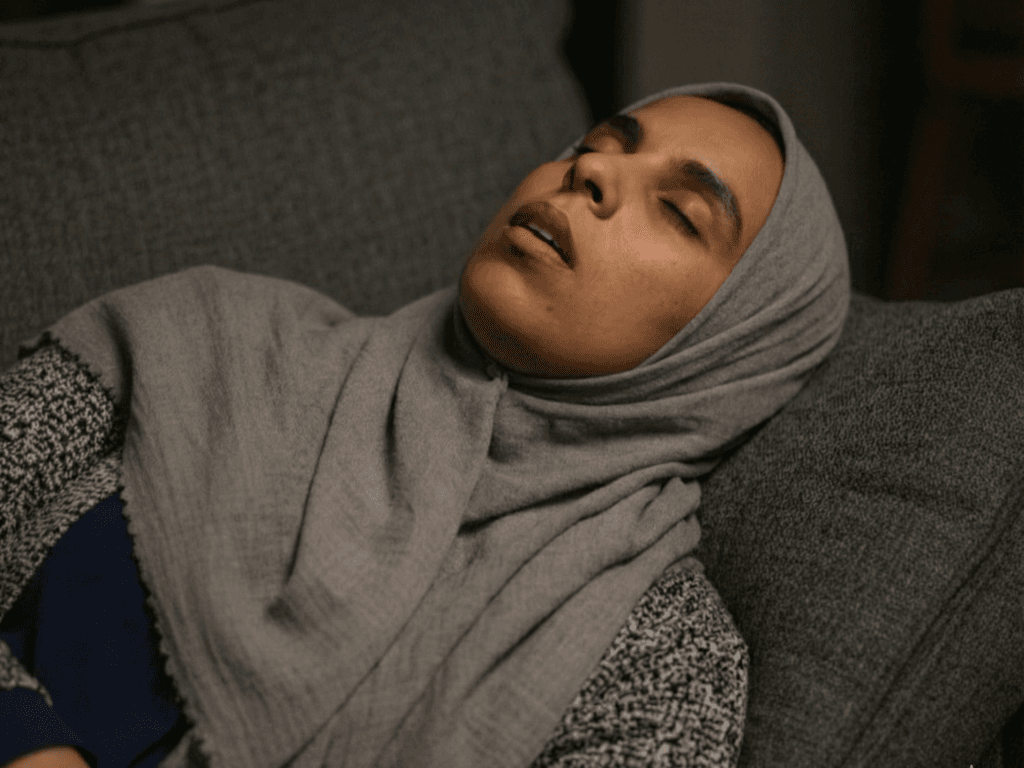 She was lying on her side, one arm under the pillow, the other draped across her stomach. That light-grey hijab is still perfectly pinned, framing her sleepy face (those long lashes, the soft pouty lips that always say “Assalamualaikum” in the sweetest voice). Her cardigan had ridden up a little, showing the curve of her waist under that tight navy abaya. The fabric clung to her body like it was painted on: full, heavy tits rising and falling with every slow breath, hips wide and juicy, and that fat, round ass pushed out toward the edge of the couch like it was begging for trouble.